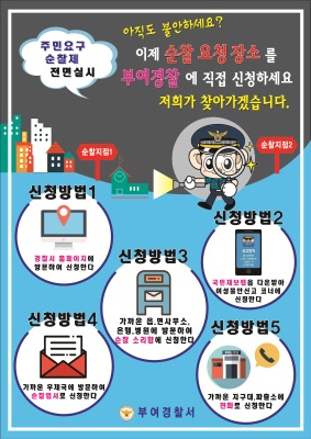 부여경찰서(서장 박종혁)는 17일 부터 주민이 요구하는 장소·시간 위주로 지역경찰 순찰체계를 전환하여 주민 불안 요소를 해소해 주는 주민요구(탄력) 순찰제를 실시한다.