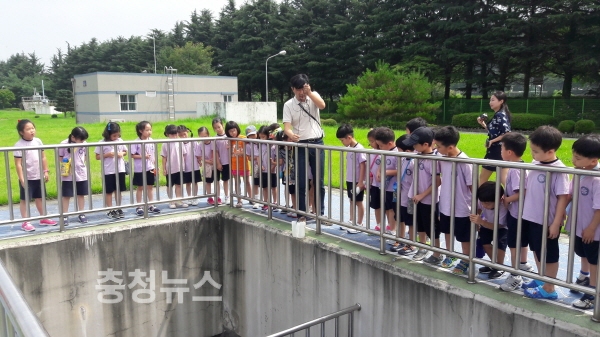 이날 용산초등학교 어린이들은 수질오염 예방 교육 후 하수 중에 가라앉은 찌꺼기를 분리 처리하는 침전지와 미생물을 이용하여 오염물질을 제거하는 생물반응조 등을 둘러봤다.