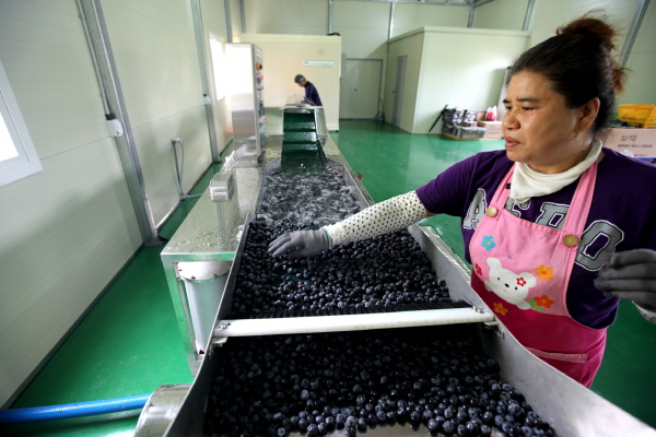 이 시스템은 블루베리를 수확한 직후 저온저장고에서 7~8시간 정도 예냉한 뒤 살균과 세척, 탈수 시스템(60㎏/시간)으로 처리해 생과로 유통하거나, 급속 냉동시킨 후 냉동과로 유통할 수 있다.
