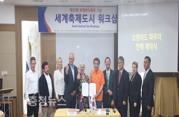 충남 보령시는 지난 22일 머드비치호텔에서 김동일 시장과 뉴질랜드 로토루아 스티브 채드윅 시장 등 관계자 30여 명이 참석한 가운데 뉴질랜드 로토루아 머드파우드 수출 계약을 체결했다.