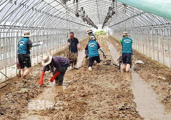 태안군 자원봉사단은 지난 18일 현장답사를 통해 피해상황과 필요인력 및 물품 등을 파악한 뒤 22일 오전 7시 태안우체국 인근에 집결해 버스를 타고 천안시로 이동, 과수원과 비닐하우스 시설의 잔해물을 정리하고 하천이 범람한 농경지의 토사와 자갈을 제거하며 구슬땀을 흘렸다.