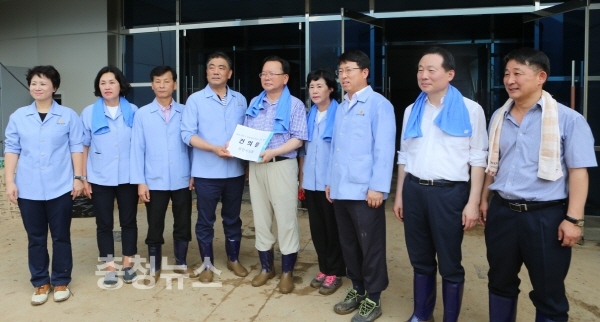이날 전종한 의장을 비롯한 천안시의회 의원들은 장관과 현장에서 함께 복구 작업에 동참하면서 지난 20일 제204회 임시회에서 채택한 “천안 특별재난지역 선포 건의문”을 김 장관에게 전달했다.