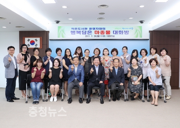 대전 서구(구청장 장종태)는 24일 구청 대회의실에서 작은도서관 운영자 등 20명이 참석한 가운데 ‘행복 담은 마중물 대화방’ 행사를 했다고 밝혔다.