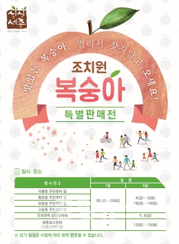 8월 4일에는 조치원역 공영주차장에서, 8월 12일부터 15일에는 호수공원 일원에서 복숭아 특별판매장을 운영하여 방문객들에게 시식 및 체험, 구매 기회를 제공한다.