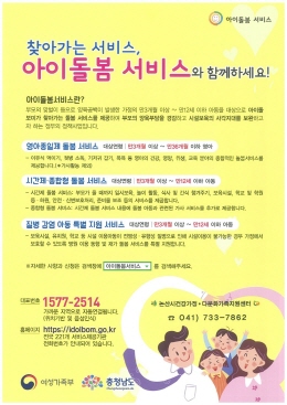 아이돌봄서비스에 관한 자세한 사항은 사회복지과 여성팀이나 논산시건강가정·다문화가족지원센터로 문의하면 된다.