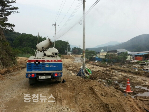 충남 천안시 서북구보건소 감염병대응센터는 침수지역의 감염병 예방을 위한 집중 방역 활동을 펼치고 있다.