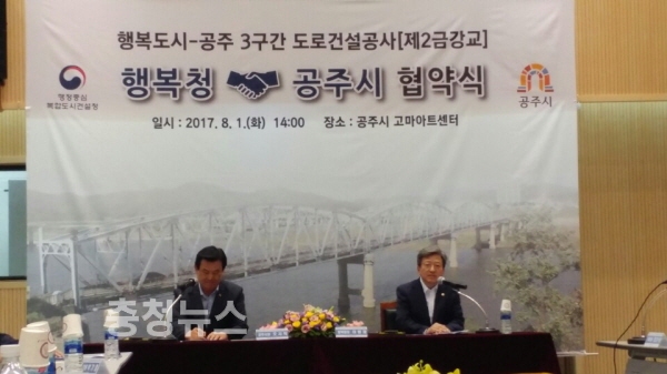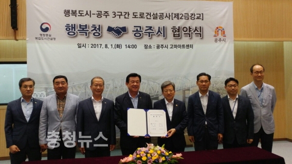 양 기관은 ‘행복도시-공주 연결도로 3구간(이하 제2금강교)’의 원활한 건설을 위한 업무협약을 1일 공주 고마센터에서 체결했다고 밝혔다.