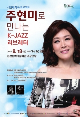 논산시(시장 황명선)는 오는 18일 오후 7시 30분 문화예술회관에서 ‘문예회관과 함께하는 방방곡곡 문화공감 - 주현미로 만나는 K-JAZZ’ 공연이 펼쳐진다고 4일 밝혔다.