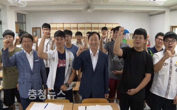 파이팅을 외치고 있는 설동호 교육감과 중앙고 학생들