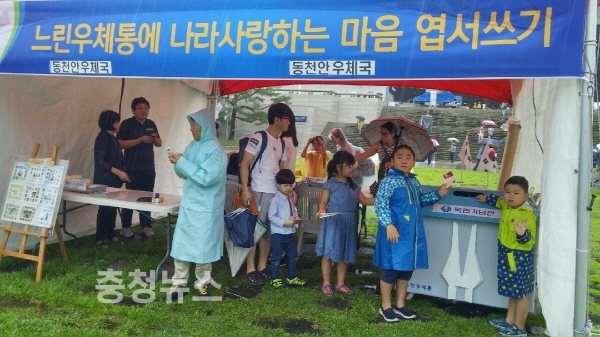 동천안우체국(국장 임성민)은 15일 광복절이자 독립기념관 개관 30주년을 맞이하여 느린우체통 설치를 통해 추모·염원, 통일기원 등 손편지(엽서)쓰기로 순국선열의 값진 희생을 되짚어보고 애국심을 함양하는 계기를 마련하기 위한 홍보 부스를 운영한다.