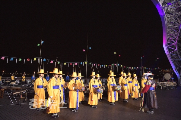 무대섬 공연장에서는 낙화를 배경으로 국가 중요 무형문화재 49호인 송파산대놀이를 비롯해 전통 문화예술 공연과 국악인 박애리와 댄서 팝핀현준이 국악과 힙합의 조화를 선보인다.