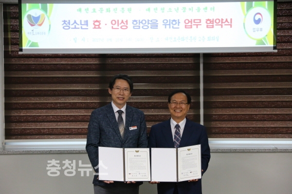 대전효문화진흥원(원장 장시성)과 대전청소년꿈키움센터(소장 윤용범)는 지역 내 청소년의 효와 인성교육을 통한 건강한 생활을 지원하고 비행예방 및 준법의식을 고취시켜 청소년 육성에 기여하기 위해 16일 대전효문화진흥원에서 업무협약을 실시했다.