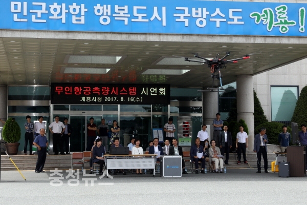 시는 지난 16일 오후 시청 현관 앞에서 최홍묵 시장을 비롯한 관계 공무원 등 20여 명이 참석한 가운데 최근 도입한 무인항공측량시스템(드론)에 대한 시연회를 가졌다.