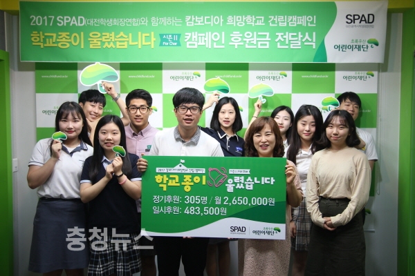 초록우산어린이재단 대전지역본부(본부장 박미애)는 지난 19일 초록우산어린이재단 대전지역본부 회의실에서 SPAD(대전학생회장연합) 6기(회장 대신고3 이우열)와 관계직원이 참석한 가운데 캄보디아 희망학교 건립 캠페인 “학교 종이 울렸습니다 시즌 2 for Char” 후원금 전달식을 가졌다.