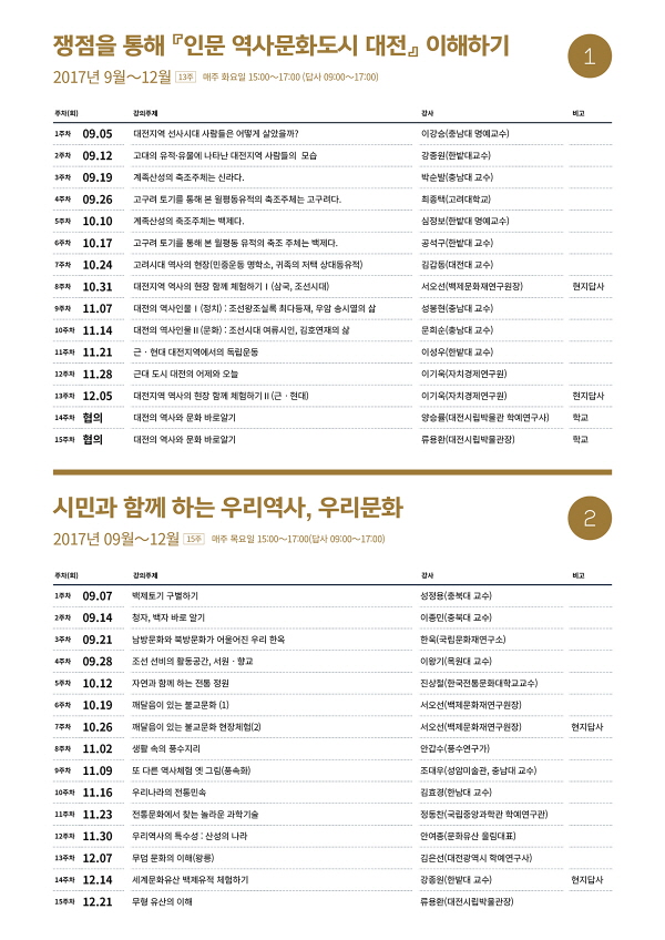 이 강좌에서는 ‘인문역사도시 대전 이해하기’와 ‘시민과 함께하는 우리역사 우리문화’ 등 2개 주제로 나누어 오는 9월 5일부터 12월 21일까지 각각 15주 동안 수업을 진행한다.
