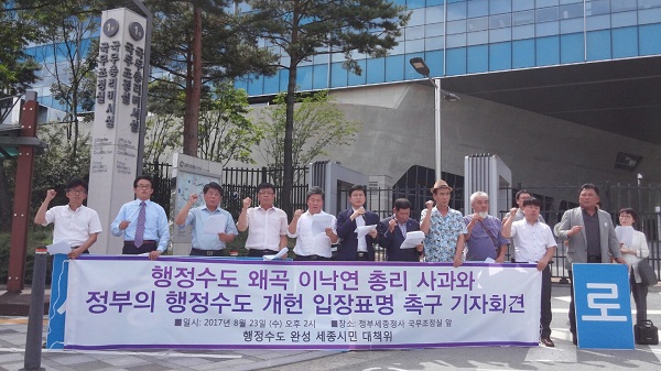 행정수도 완성 세종시민 대책위(상임대표 맹일관, 최정수)는 23일 오후 정부세종청사 국무조정실 앞에서 가진 기자회견을 갖고 “행정수도를 왜곡하고 부정적 여론을 확산시킨 이낙연 총리는 사과하고, 정부는 행정수도 개헌에 대한 명확한 입장을 표명하라"고 요구했다.