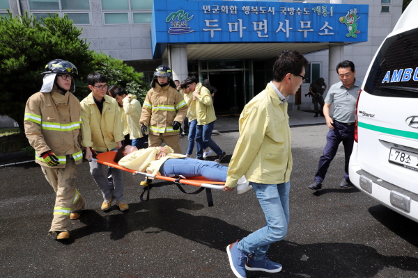 피해 상황 대응훈련은 시 직원들의 긴급대피, 소방서의 화재진압, 군부대의 생존자 수색 및 경계활동, 굴삭기 청소차량의 응급복구, 보건소의 방역 그리고 의용소방대의 심폐소생술 교육 등의 순서로 진행됐다.