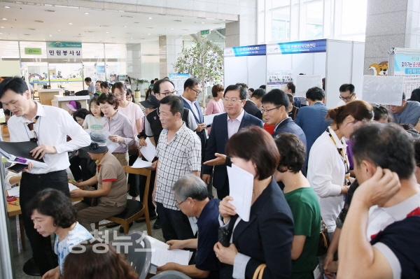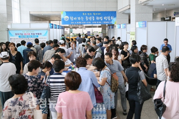 대전 서구(구청장 장종태)가 28일 구청 로비에서 개최한 ‘중년층 취업박람회’에 800여 명의 구직자가 몰려 뜨거운 열기를 보였다.