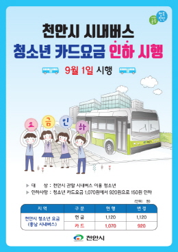 충남 천안시가 다음달 1일부터 시내버스 청소년 카드요금을 150원 인하한다.