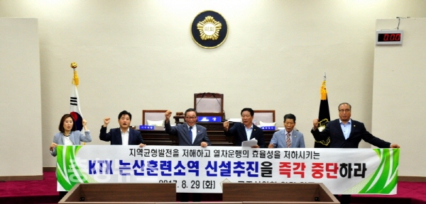 공주시의회는 29일 오전 윤홍중 의장을 비롯한 의원들이 모여 최근 정부에서 KTX 논산훈련소역 설치와 관련 타당성 재조사 용역을 추진하고 있는 사실에 대해 결연히 반대한다며 KTX 논산훈련소역 신설 백지화를 촉구하는 성명서를 발표했다.