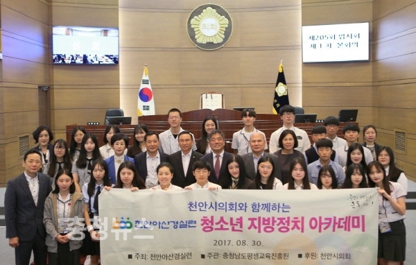 천안아산경실련에서 주관하는 ‘2017 청소년 지방정치 아카데미’에 참여하는 천안아산 소재 고교생 25명은 지난 30일 천안시의회(의장 전종한)를 방문했다. 이번 청소년 지방정치 아카데미는 학생들이 삶과 밀접한 정치를 이해하고 직접 견학 및 토의, 토론을 통해 지방정치의 참여도를 높이기 위해 마련되었다.