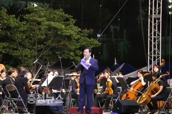 1일 정림동 갑천 변 둔치에서 ‘한여름 밤의 음악회’ 가 개최된 가운데 장종태 구청장 인사말 모습