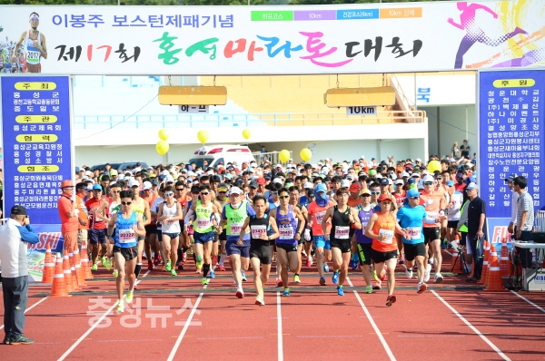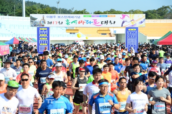 3일 오전 9시, 홍성군에서 열린 ‘제17회 이봉주 보스턴 제패기념 홍성마라톤대회’에 참여한 3천여 명의 마라토너들이 출발 신호와 함께 힘차게 달리고 있다.