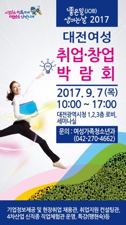 대전시는 오는 7일 오전 10시부터 오후 5시까지 대전시청 1,2,3층 로비에서 ‘2017 대전여성취업․창업 박람회’를 개최한다.