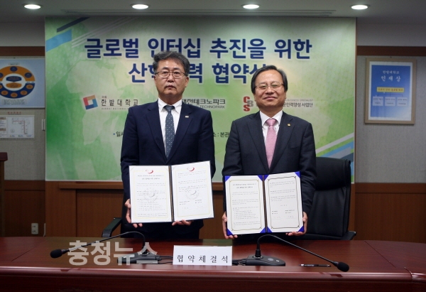 한밭대 ‘글로벌 인턴십 추진을 위한 산학협력 협약식’에서 송하영 총장과 대전TP 편광의 원장이 협약서에 서명했다.(사진 우측 송하영 총장, 좌측 편광의 원장)