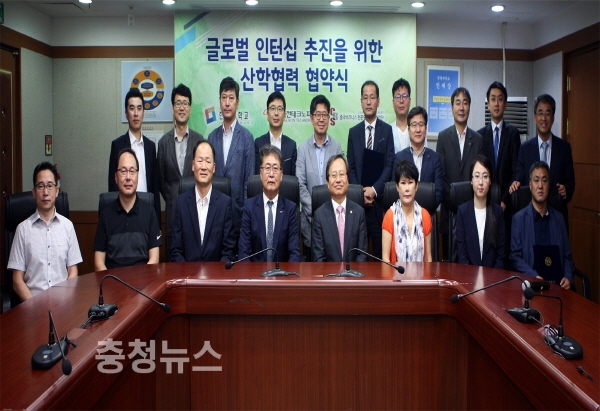 한밭대 ‘글로벌 인턴십 추진을 위한 산학협력 협약식’에서 협약에 참여한 기관, 기업 대표들이 기념촬영을 하고 있다.(사진 앞줄 우측 네 번째부터 송하영 총장, 편광의 원장)