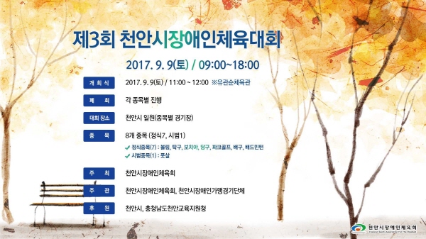 충남 천안시장애인체육회는 이달 9일 천안시장애인종합체육관을 비롯한 8개 장소에서 1,000여명의 장애체육인들이 참가한 가운데 ‘제3회 천안시장애인체육대회’를 개최한다.