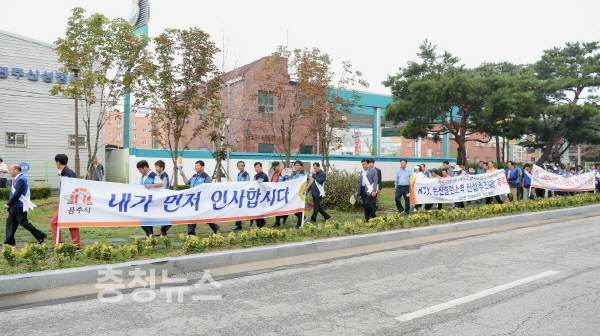 충남 공주시(시장 오시덕)가 7일 시민과 공직자 등 1천여명이 참여한 가운데 문화관광도시로서 손님맞이를 위한 범 시민 친절운동다짐대회를 공산성 주차장에서 개최, 중동사거리까지 캠페인을 실시했다고 밝혔다.