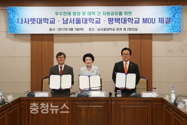 나사렛대학교(총장 임승안), 남서울대학교(총장 공정자), 평택대학교(총장 이필재)는 7일 남서울대 본관 1층 국제회의실에서 우수인재 양성과 자원공유를 위해 손을 맞잡았다.