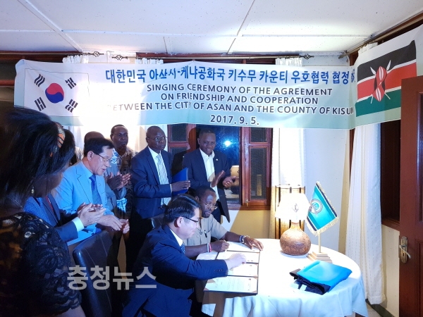 국외 교류협력과 친환경에너지 활용 시스템 등의 벤치마킹을 위해 케냐와 헝가리 등 해외 방문중인 아산시 대표단이 지난 5일 케냐 키수무州를 방문해 우호협력을 체결했다.