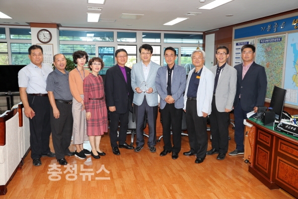 감사패 전달 후 복기왕 아산시장과 관계자들이 함께 기념 촬영을 하고 있다