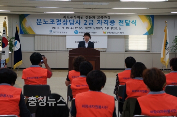 대전지방검찰청(검사장 이상호)과 대전범죄피해자지원센터(이사장 이두식)는 13일 대전지방검찰청 3층 중회의실에서, 대전범죄피해자지원센터 자원봉사위원의 전문화 교육과정의 일환으로 실시한 분노조절상담사 2급 자격과정 수료자에 대한 자격증 전달식 행사를 가졌다.