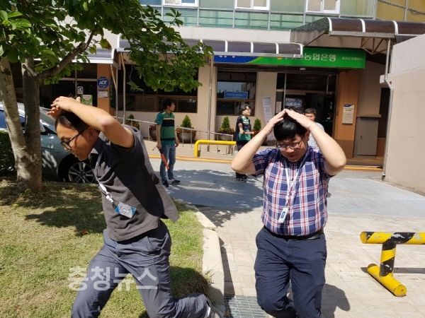 이에 홍성군청 직원들은 그동안 글이나 그림 등으로만 접해왔던 지진대비 국민행동요령에 대한 행동을 훈련을 통해 직접 취해 봄으로써 지진재난 발생 시 신속한 대처와 안전한 대피를 할 수 있도록 지진대비 국민행동요령에 맞춰 사무실 책상 및 테이블 밑으로 대피하는 실내대피, 가방 등으로 머리를 보호한 후 안전지역으로 이동하는 실외대피 등 실제 상황과 같은 긴박한 상황 속에서 지진대응 훈련에 임했다.