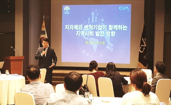 지난 14일 충남벤처협회 주관으로 개최된 ‘2017 제4회 벤처기업인 아카데미’에서‘지자체와 벤처기업이 함께하는 지역사회 발전방향’이라는 주제로 진행된 강연에서
