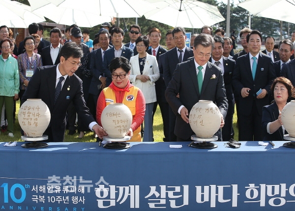 도는 이날 만리포해수욕장 희망무대에서 지역 주민과 자원봉사자, 문재인 대통령, 안희정 지사, 김은경 환경부 장관, 김영춘 해양수산부 장관, 성일종 국회의원, 한상기 태안군수 등 3000여 명이 참석한 가운데 ‘유류피해 극복 10주년 기념식’을 개최했다.