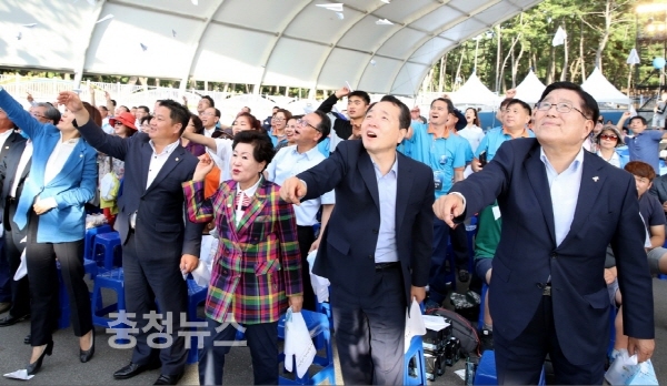 '희망 종이비행기 날리기 '우측으로부터 한상기 군수, 성일종 국회의원, 이용희 군의회 의장