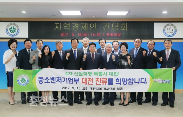 앞서 지난 15일 대전시청에서 권선택 대전시장 주재로 개최됐던 ‘지역경제인 간담회’에서 박희원 대전상의 회장을 비롯한 지역 경제단체장들이 중소벤처기업부의 대전 잔류를 희망하는 건의문을 채택한 바 있다.
