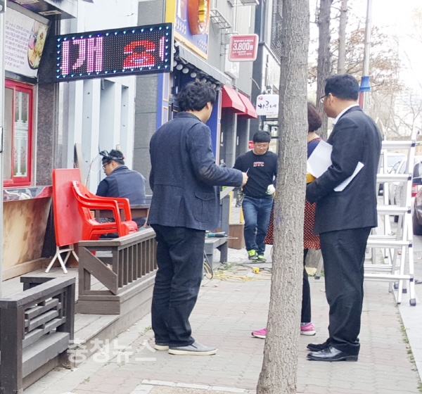 산시 관계자가 불법 공작물 설치한 업소를 방문해 자진 철거를 유도하고 있는 모습