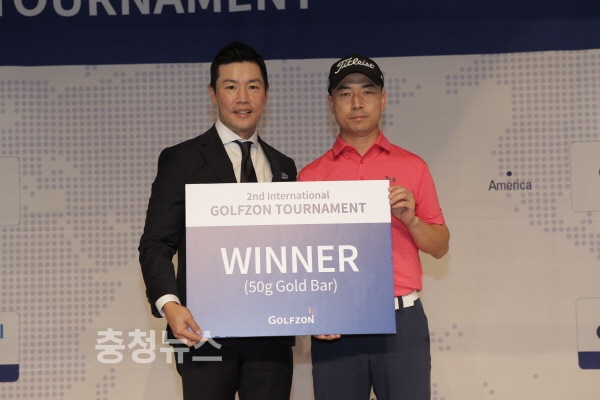 제2회 골프존 국제대회 개최_(왼쪽 골프존 김주현 글로벌사업본부장, 오른쪽 우승자 한쉐강)