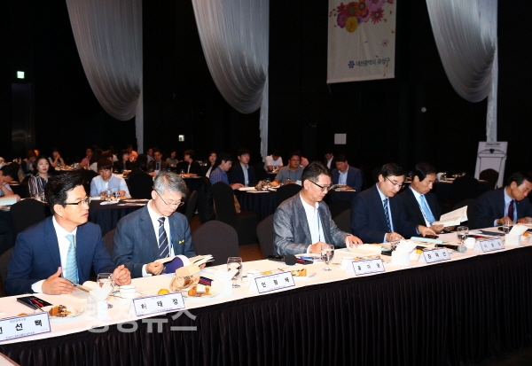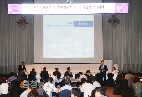 허태정 유성구청장은 환영인사를 통해 “과학기술의 중심 대전 유성구에서 전국 자치단체장들이 한 자리에 모여 4차 산업혁명의 시대 지방정부 차원의 선제적 대응방안과 과학적 행정체계 구축위한 계획 등을 공유하고 나누게 된데 대해 뜻 깊게 생각한다”고 밝혔다.