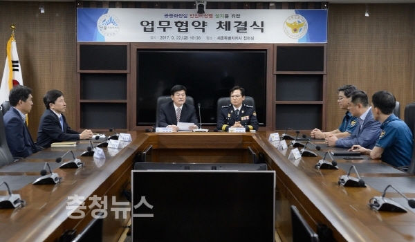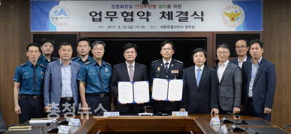 세종특별자치시(시장 이춘희)는 22일 시청 집현실에서 이춘희 시장과 김철문 세종경찰서장을 비롯, 관계 공무원 등이 참석한 가운데 ‘공중화장실 안심비상벨’설치를 위한 업무협약을 체결했다.