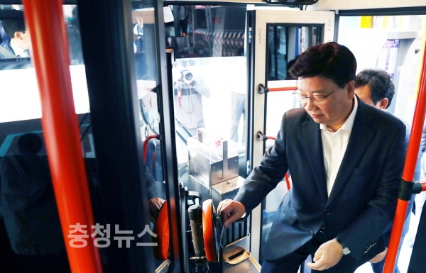 22일 아침 권선택 대전시장이 버스를 이용해 출근하고 있다.