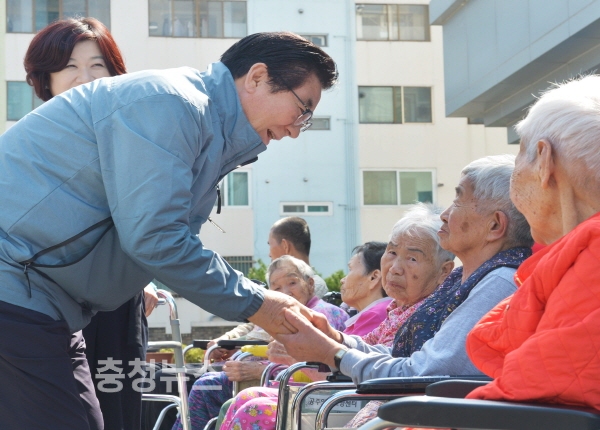 윤석우 충남도의회 의장이 노인복지센터를 찾아 위문하는 모습