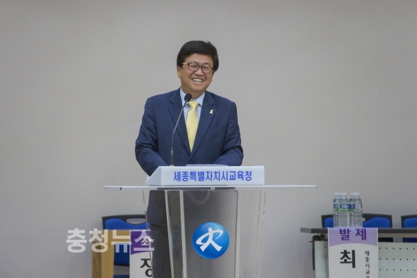 22일 세종시교육청 2층 대강당에서 ‘세종교육정책포럼’ 중 최교진 교육감 인사말 모습