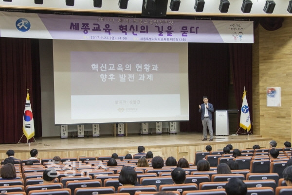 먼저, 경희대 성열관 교수가 제1주제로 ‘혁신교육의 5가지 키워드와 향후 실천 과제’에 기조발제를 하였고, 이어서 세종시교육청 최탁 장학사가‘세종교육 혁신의 현황과 발전 방향 탐색’을 제2주제로 발표했다.