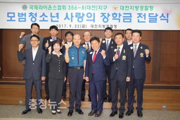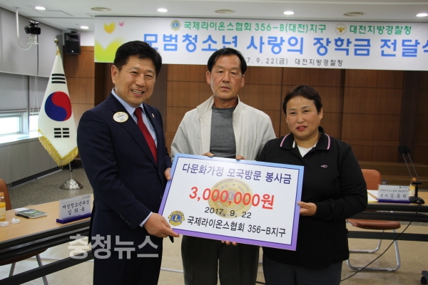 국제라이온스협회 356-B(대전)지구 김동원 총재를 비롯한 5개 지역부총재단은 합동으로 지난 22일 대전지방경찰청 대회의실에서 모범청소년 10명과 다문화가정(중국) 모국방문비 지원봉사를 가졌다.